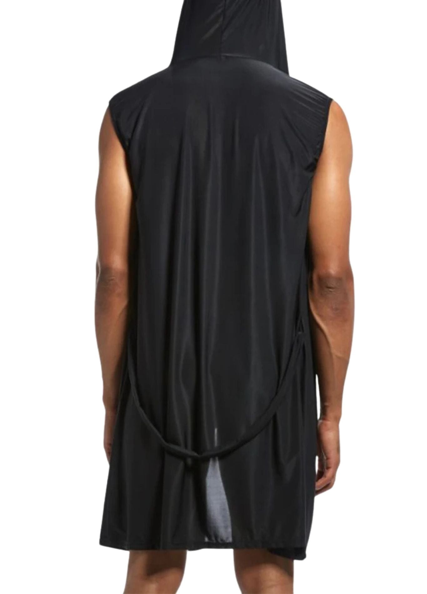 Sans manches, avec un col en v profond et une capuche allongée, il dessine une silhouette plus tranchée. L’ensemble reste simple, mais l’effet est immédiat.